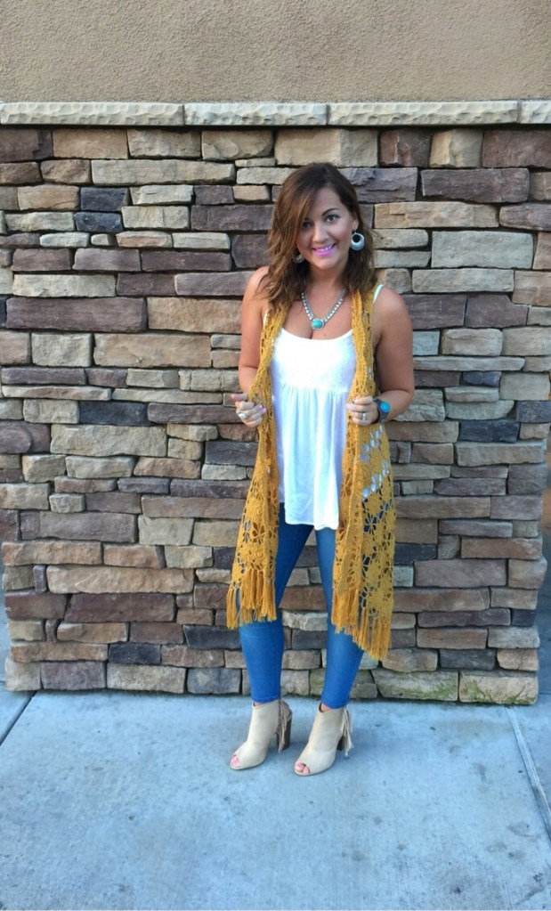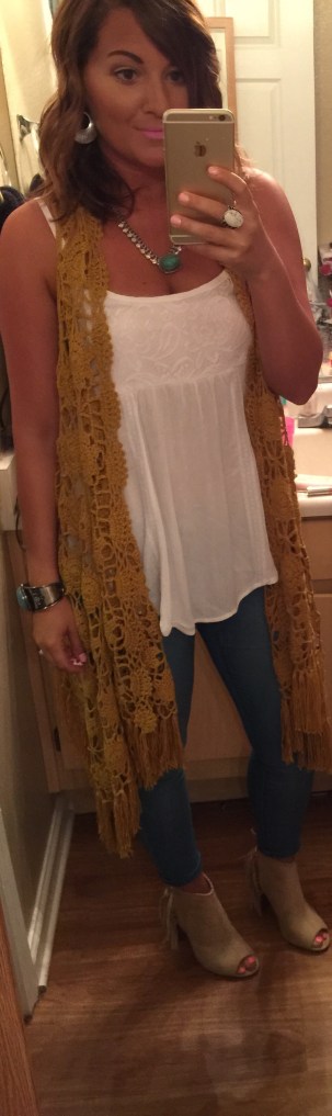 OOTD 4-10-15 Top: Tillys Crochet vest: Buckle Jeans: Forever 21 Booties: justfab.com Share this: Share on X (Opens in new window) X Share on Facebook (Opens in new window) Facebook Share on Pinterest (Opens in new window) Pinterest Share on Tumblr (Opens in new window) Tumblr Like Loading...